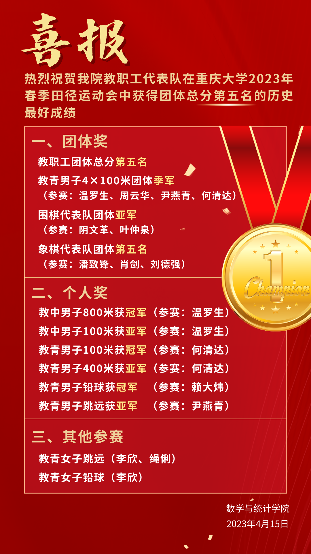 喜讯|数学与统计极速赛车官网 教职工在重庆大学2023年春季田径运动会中喜获佳绩