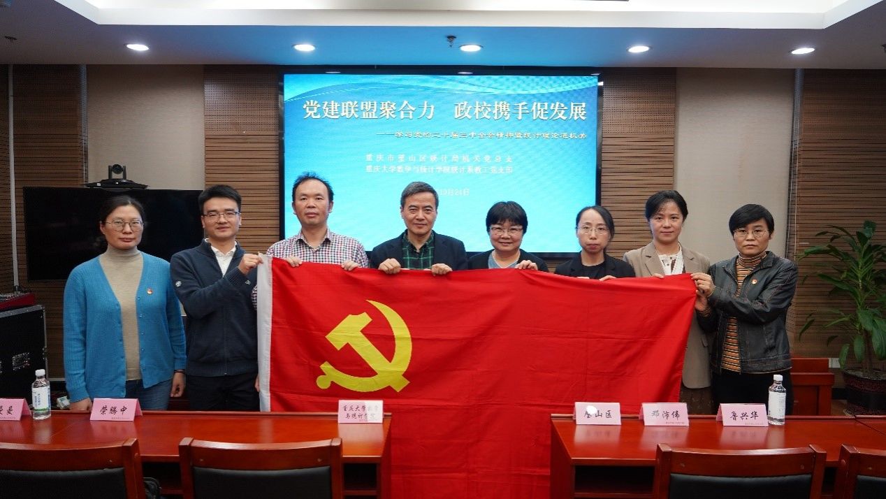 统计系教工党支部秉承相互学习交流、共享优势资源理念,积极探索校地党建共建新模式,激发基层党建高质量发展活力。10月24日,统计系教工党支部与璧山区统计局机关党总支联合开展“党建联盟聚合力,校地携手促发展”的主题党日活动,璧山区统计局党组书记邓沛伟主持会议,院党委书记刘卫红出席会议,双方党支部的全体党员同志参加此次会议。