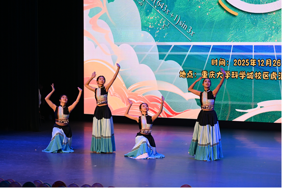 本次晚会以“数统‘π’对”为主题,巧妙融合数学元素与青春风采,节目形式多样,内容丰富。由“晨曦计划”乐队带来的《鲜花》《奔跑》拉开了晚会序幕,点燃了全场热情。随后,活力四射的舞蹈《Kiss & Tell》、诙谐生动的小品《杀死一只周日鸟》、优美的彝族舞蹈《情深意长》等节目接连上演,充分展现了数统学子多才多艺、全面发展的青春风貌。