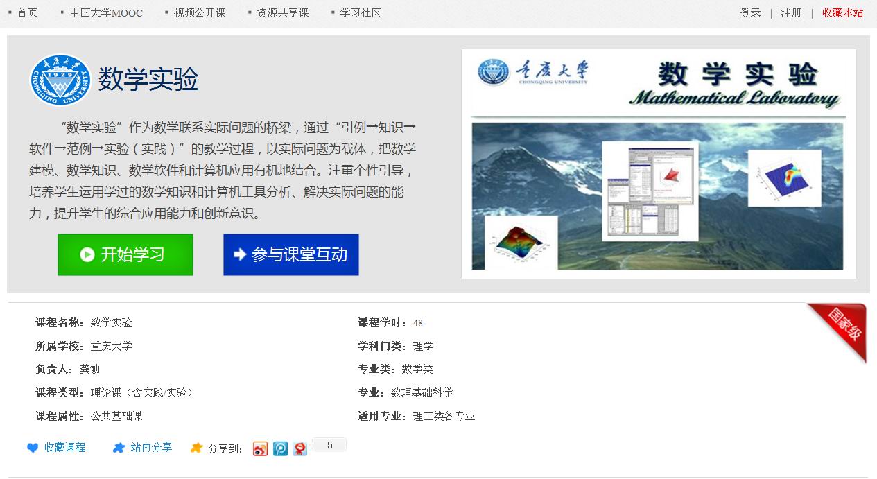 2013 年, 极速赛车官网 的“数学实验”课程进入国家精品资源共享课建设行列,点击下列图片可进入中国大学资源共享课学习平台。