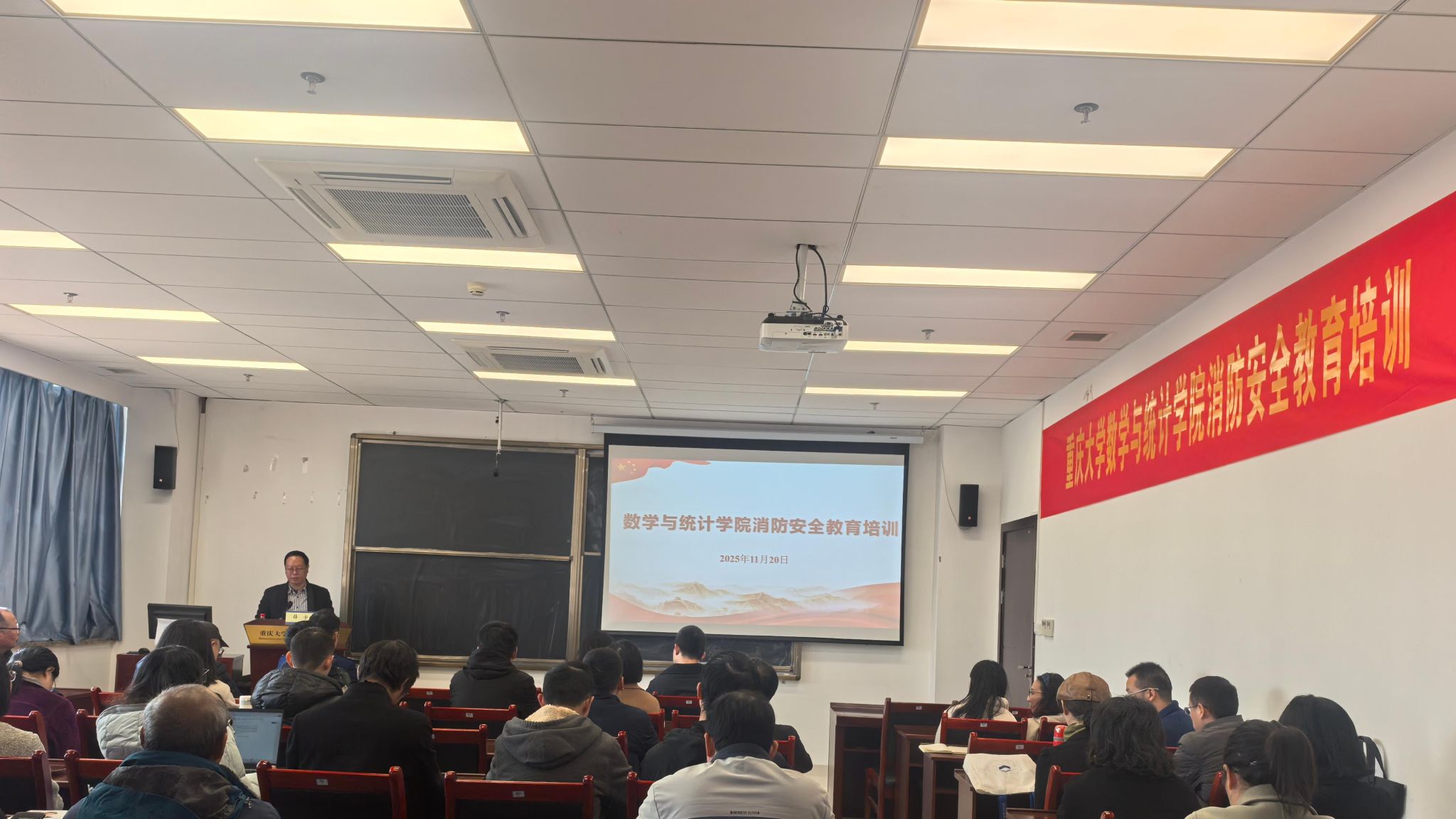 “全民消防、生命至上”。为深入宣传贯彻习近平总书记关于应急管理的重要论述和消防工作的重要指示批示精神,广泛开展消防安全宣传教育,强化师生共同遵守消防安全要求,扎实推进除险清患工作,提升师生安全文化素养。2025年11月20日,数学与统计学院开展消防安全教育培训,全体教职员工参加,学院副院长李东主持。