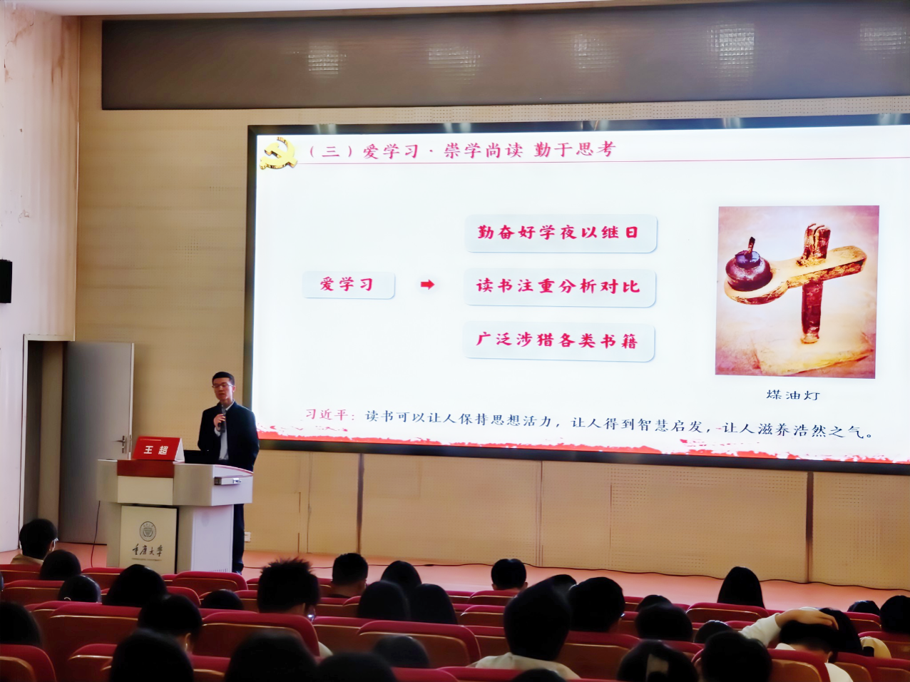 王超以“从习近平的知青岁月看青年品格修养”为主题,从知识青年上山下乡的历史背景入手,按照时间顺序梳理了作为党的核心、军队领帅、人民领袖的习近平总书记知青岁月的主要经历和特点。通过穿插图片与思维导图的方式,全面阐释了习近平总书记在青年时期如何坚定理想信念、锤炼意志品质、加强自身修养的过程,让同学们深情感受习近平总书记同人民群众同甘共苦、血肉相连的真挚情怀。